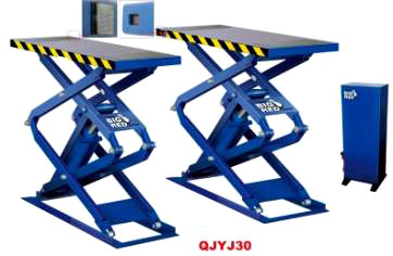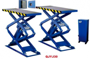 Elevator tip foarfeca, electrohidraulic, cod QJYJ30, cu mecanism de blocare actionat pneumatic, potrivit pentru autovehicule mici si mijloci in atelierele de vulcanizare si tinichigerie, capacitate de ridicare 3tone, dimensiuni platforme 1.580 x505mm,distanta de libera trecere la podea 1.660mm,distanta intre platforme 855mm, inaltimea de ridicare 1.950mm, puterea motorului 3kw, tensiune de alimentare 380V, greutate proprie 800kg.