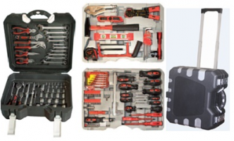Include: set de clesti, set de chei combinate 6-19mm, set de chei tubulare 1/4“, 4-13mm si 1/2“, 10-30mm, 2 chei cu clichet, prelungitoare, tester electric, “cutter”, recuperator magnetic, subler interior-exterior, set de capete de surubelnita, cate un set de surubelnite pentru atelierele de mecanica si electrica, ciocan, cleste pentru sertizat , lanterna. imbus. Sunt amplasate in suporturi termoformatatr dispuse intr-o geanta din aluminiu cu sitem de inchidere si de transport tip “troller”.